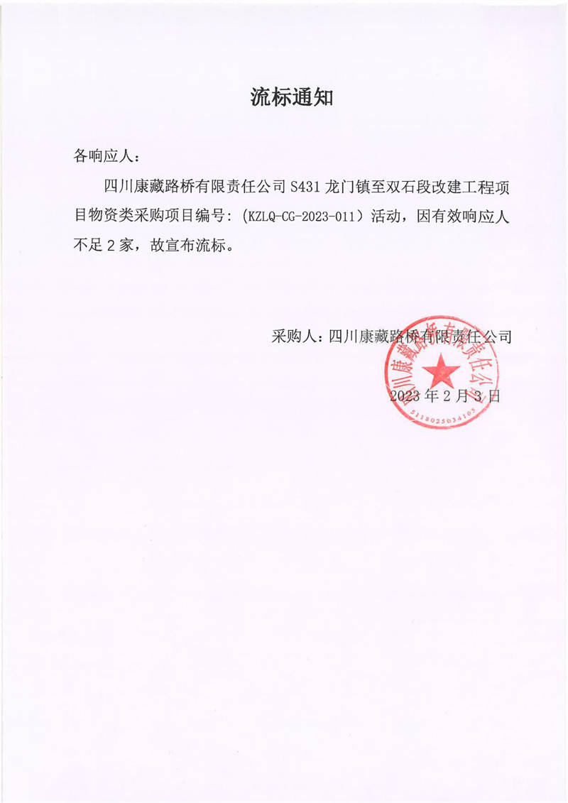 四川康藏路橋有限責(zé)任公司S431龍門(mén)鎮(zhèn)至雙石段改建工程項(xiàng)目物資類采購(gòu)流標(biāo)通知