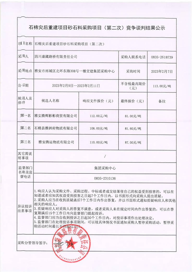 四川康藏路橋有限責任公司石棉災(zāi)后重建項目砂石料采購項目(第二次)競爭談判結(jié)果公示