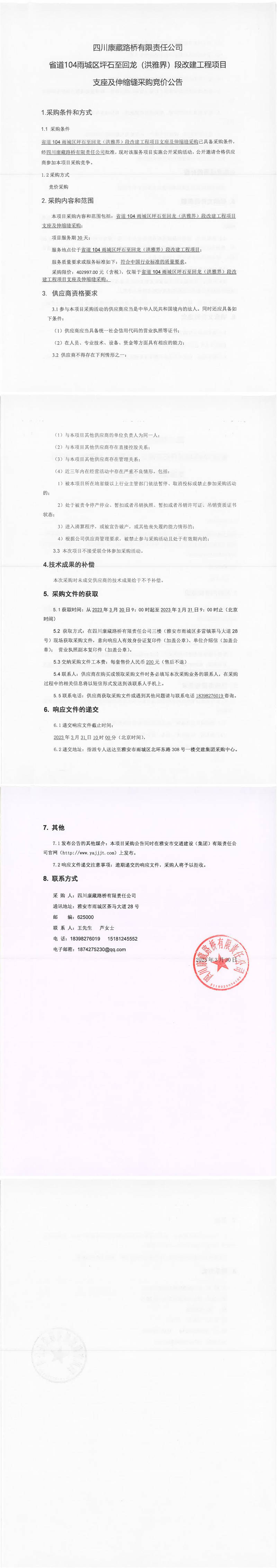 四川康藏路橋有限責(zé)任公司省道104雨城區(qū)坪石至回龍(洪雅界)段改建工程項(xiàng)目支座及伸縮縫采購競價公告