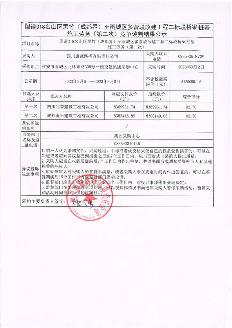四川康藏路橋有限責(zé)任公司國道318名山區(qū)黑竹(成都界)至雨城區(qū)多營(yíng)段改建工程二標(biāo)段橋梁樁基施工勞務(wù)(第二次)競(jìng)爭(zhēng)談判結(jié)果公示