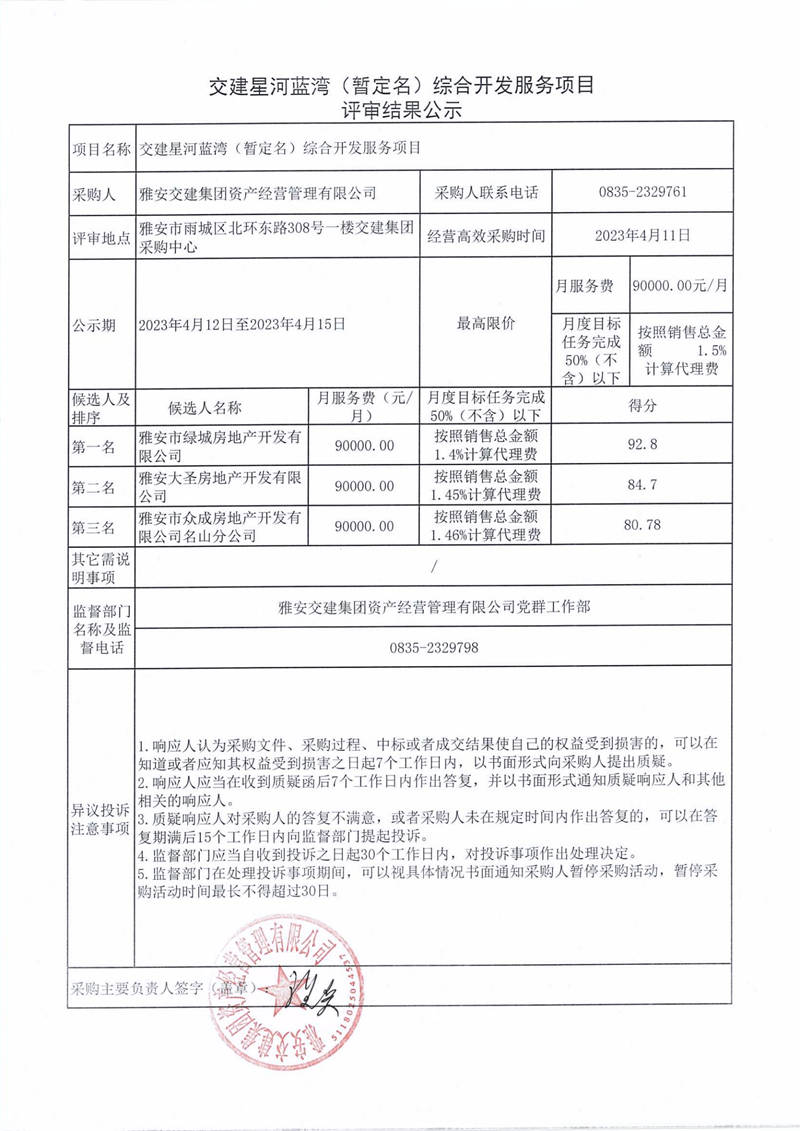 雅安交建集團資產(chǎn)經(jīng)營管理有限公司交建星河藍灣(暫定名)綜合開發(fā)服務(wù)項目評審結(jié)果公示