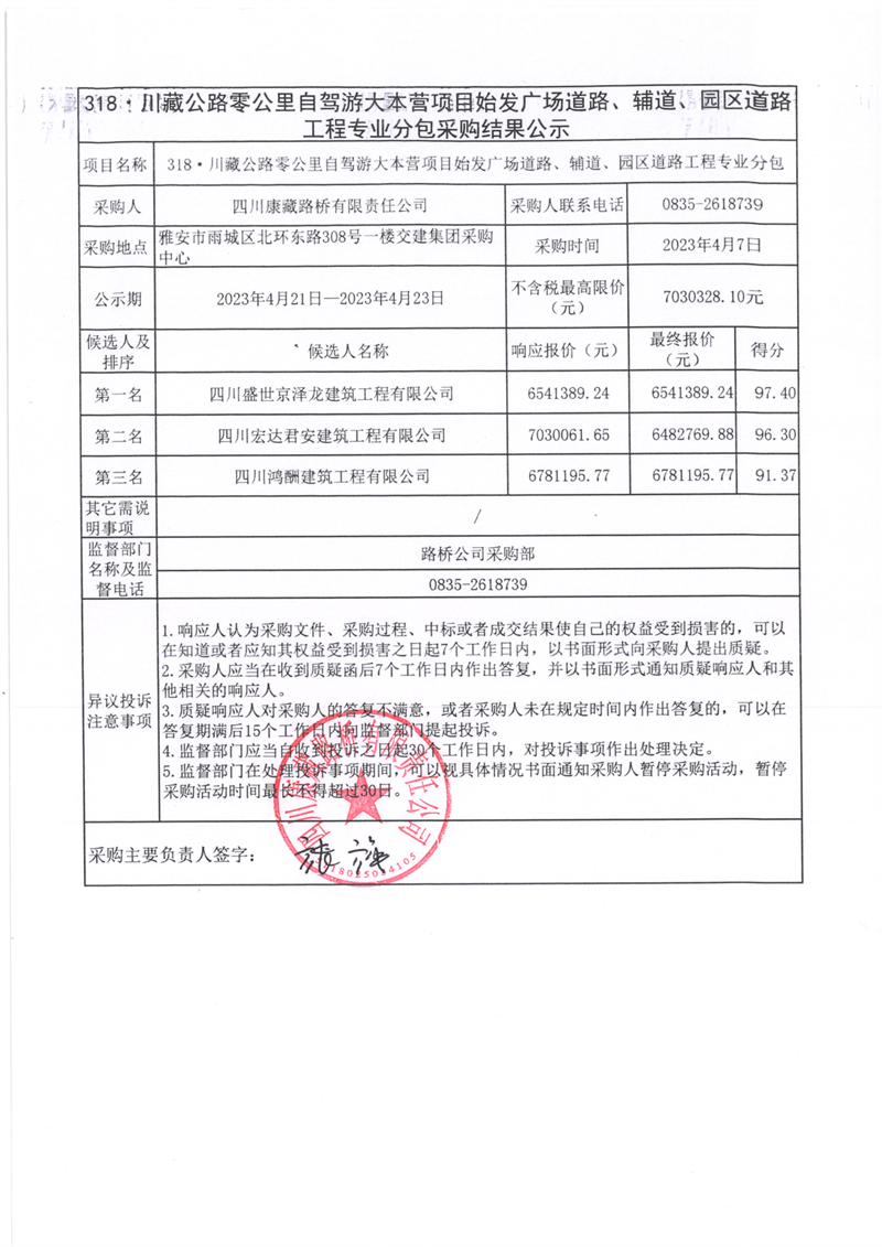 四川康藏路橋有限責(zé)任公司318·川藏公路零公里自駕游大本營項(xiàng)目始發(fā)廣場道路、輔道、園區(qū)道路工程專業(yè)分包采購結(jié)果公示