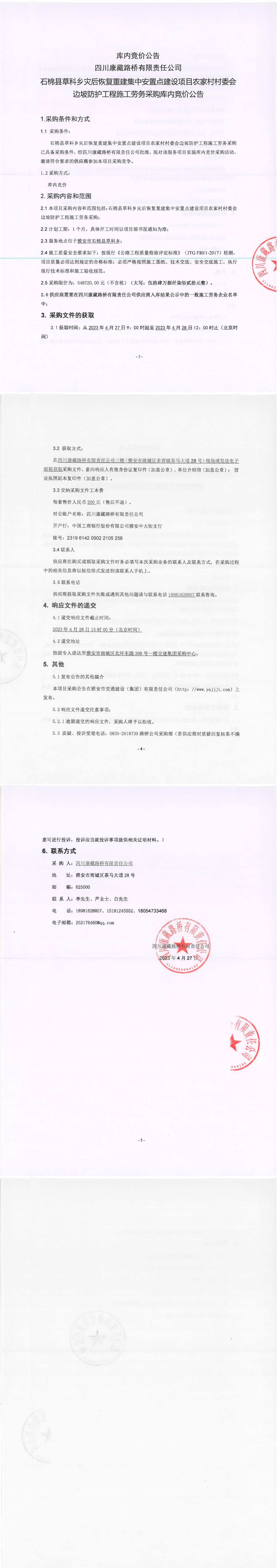 四川康藏路橋有限責任公司石棉草科鄉(xiāng)災后恢復重建集中安置點建設項目農(nóng)家村村委會邊坡防護工程施工勞務采購采購庫內(nèi)競價公告