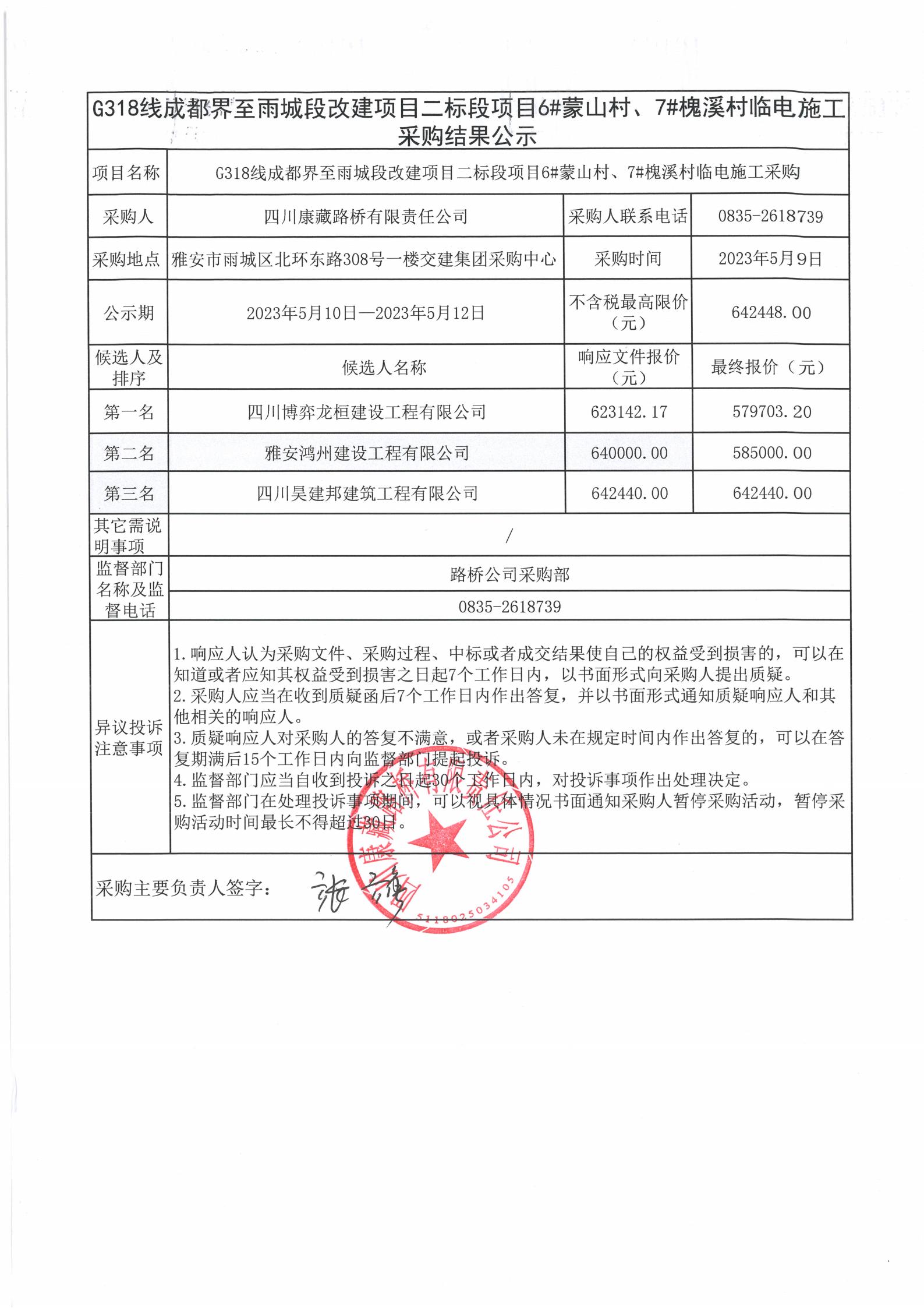 四川康藏路橋有限責(zé)任公司G318線成都至雨城段改建項(xiàng)目二標(biāo)段項(xiàng)目6#蒙山村、7#槐溪村臨時(shí)電施工采購結(jié)果公示