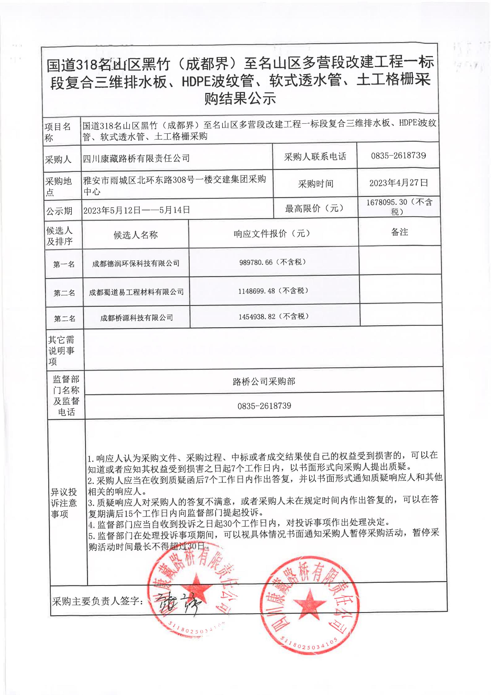 四川康藏路橋有限責(zé)任公司國道318名山區(qū)黑竹(成都界)至雨城區(qū)多營段改建工程一標(biāo)段復(fù)合三維排水板、HDPE波紋管、軟式透水管、土工格柵采購結(jié)果公示
