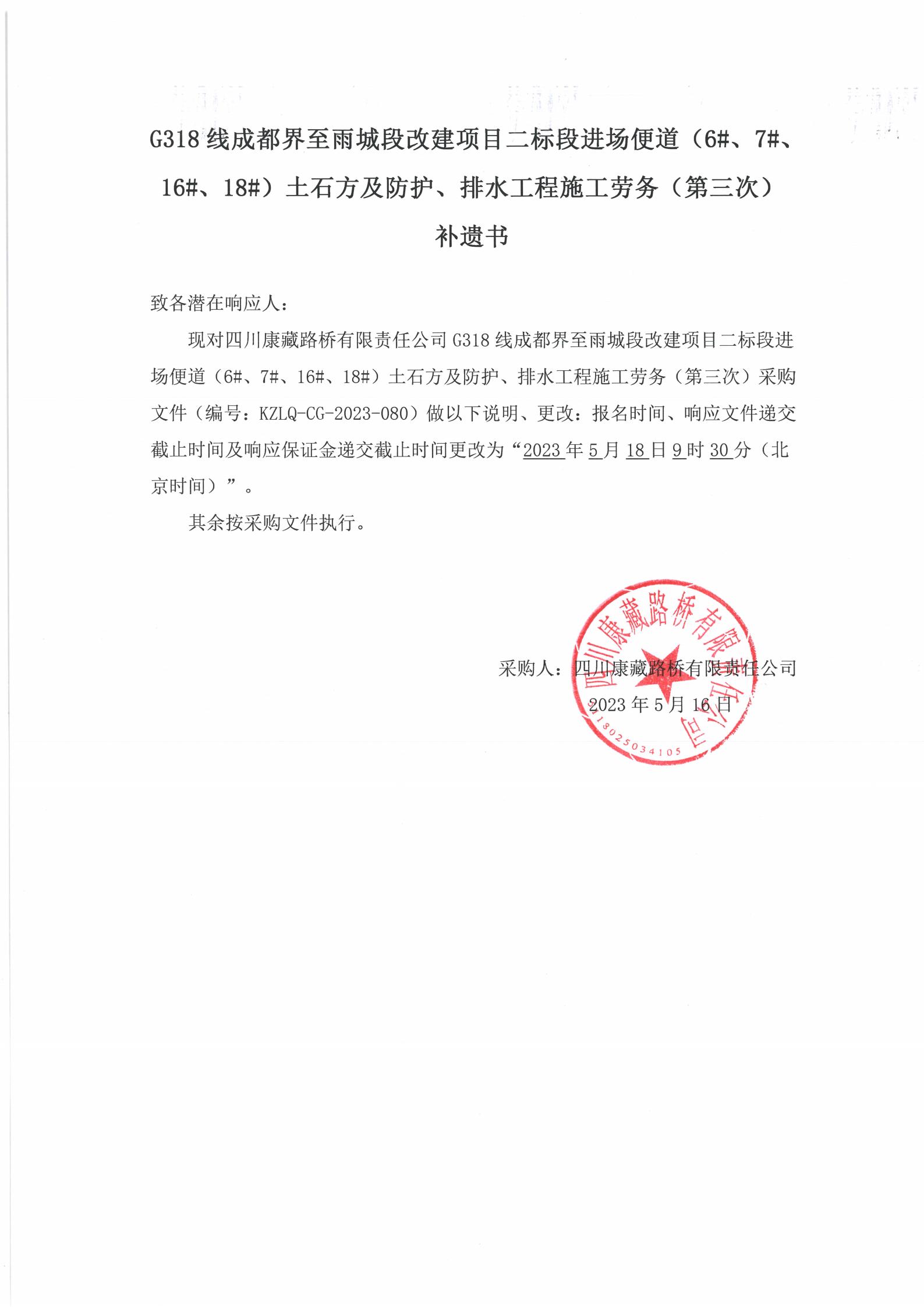 四川康藏路橋有限責(zé)任公司G318線成都至雨城段改建項(xiàng)目二標(biāo)段進(jìn)場(chǎng)便道(6#、7#、16#、18#)土石方及防護(hù)、排水工程施工勞務(wù)(第三次)補(bǔ)遺書