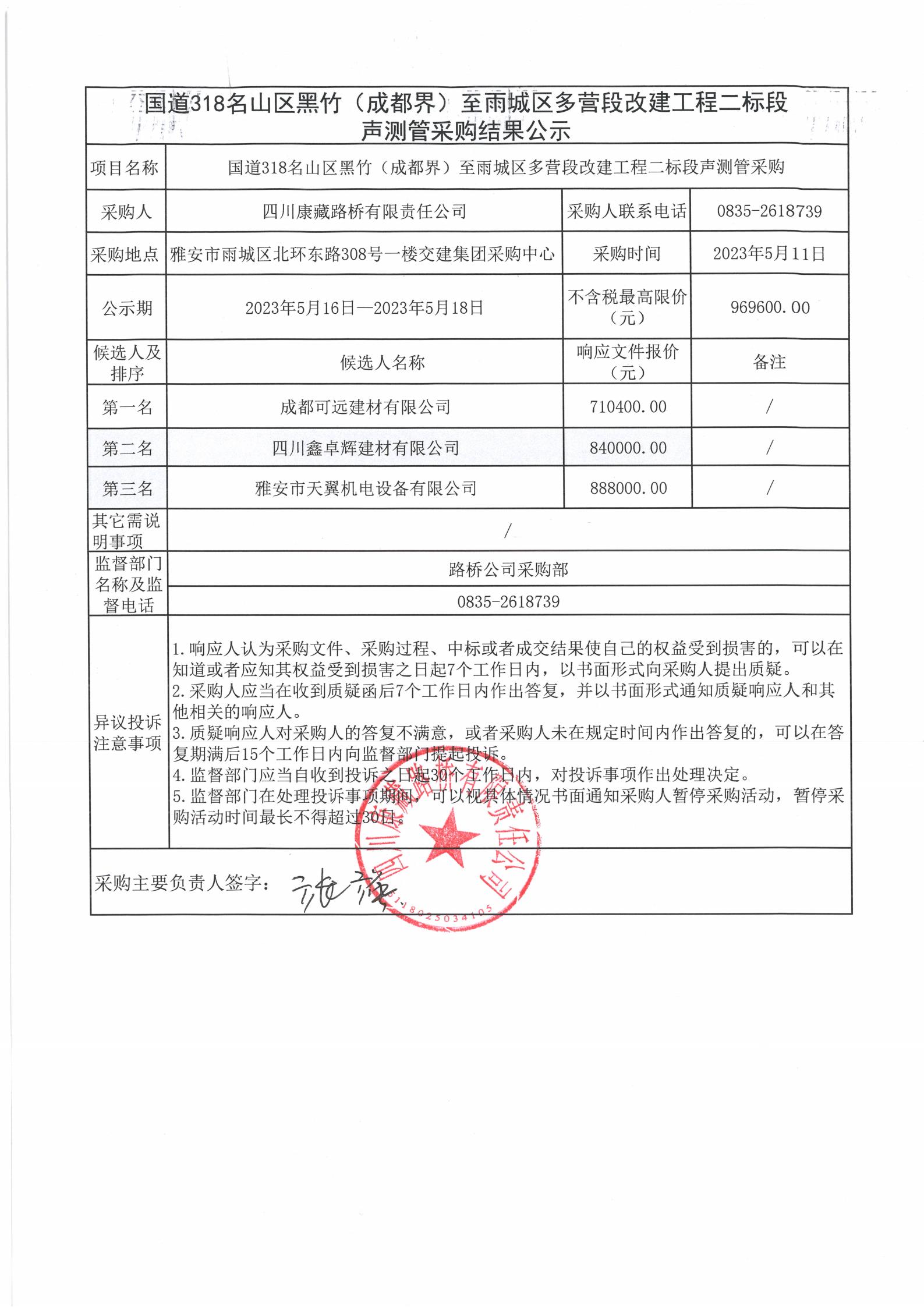 四川康藏路橋有限責任公司國道318名山區(qū)黑竹(成都界)至雨城區(qū)多營段改建工程二標段聲測管采購結(jié)果公示