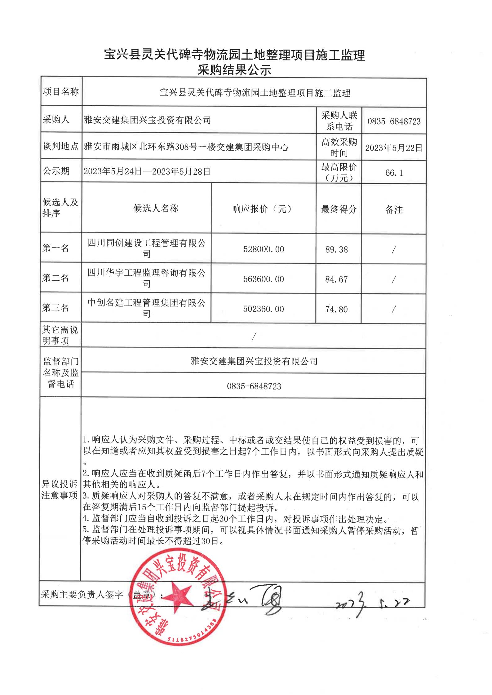 雅安交建集團(tuán)興寶投資有限公司寶興縣靈關(guān)代碑寺物流園土地整理項(xiàng)目施工監(jiān)理采購(gòu)結(jié)果公示