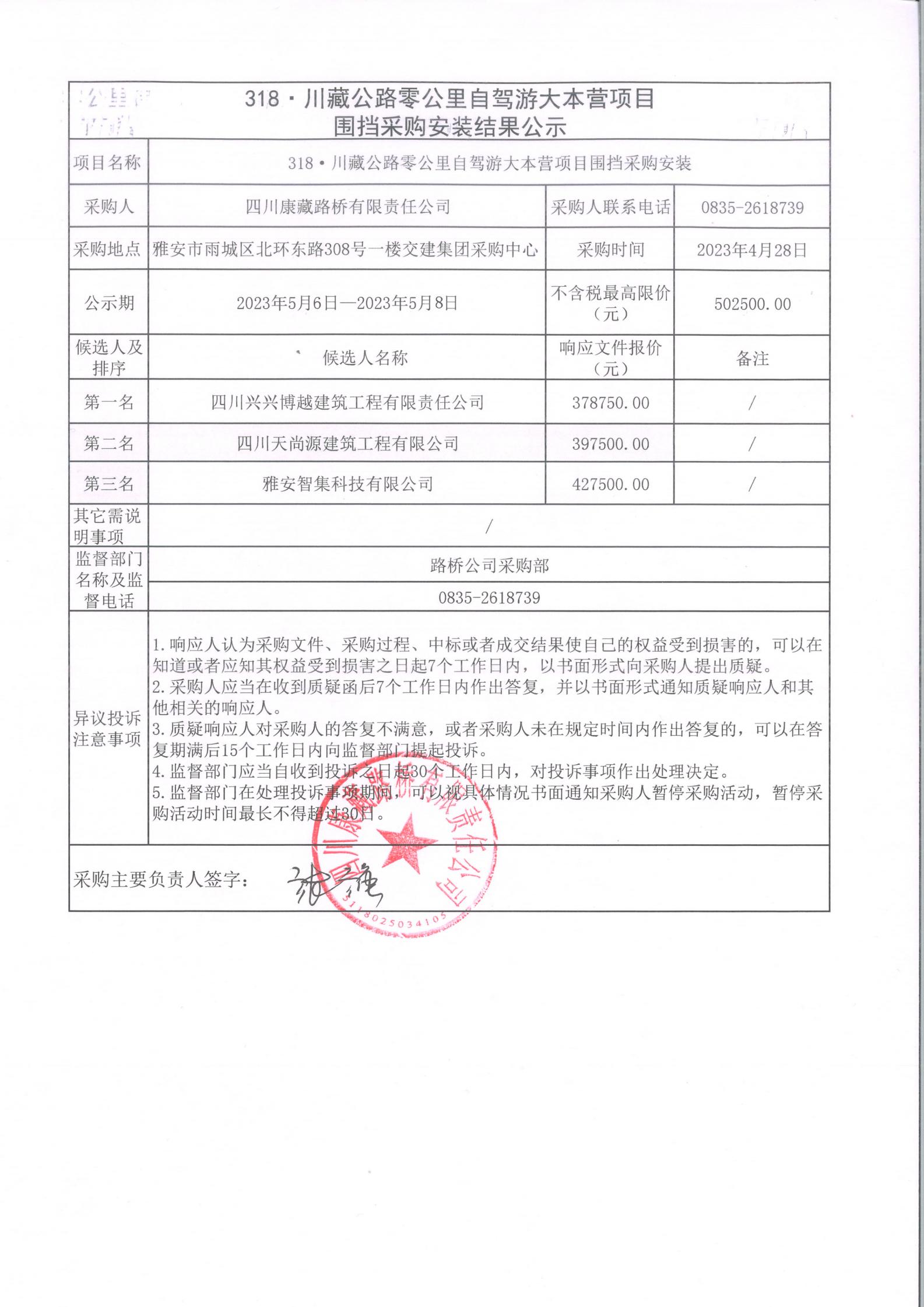 四川康藏路橋有限責任公司318·川藏公路零公里自駕游大本營項目圍擋采購安裝結果公示