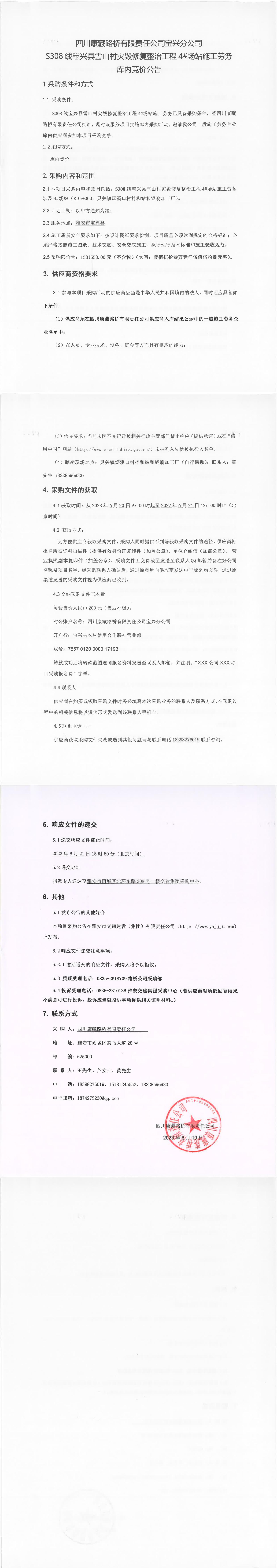 四川康藏路橋有限責任公司寶興分公司S308線寶興縣雪山村災毀整治工程4#場站施工勞務(wù)庫內(nèi)競價公告