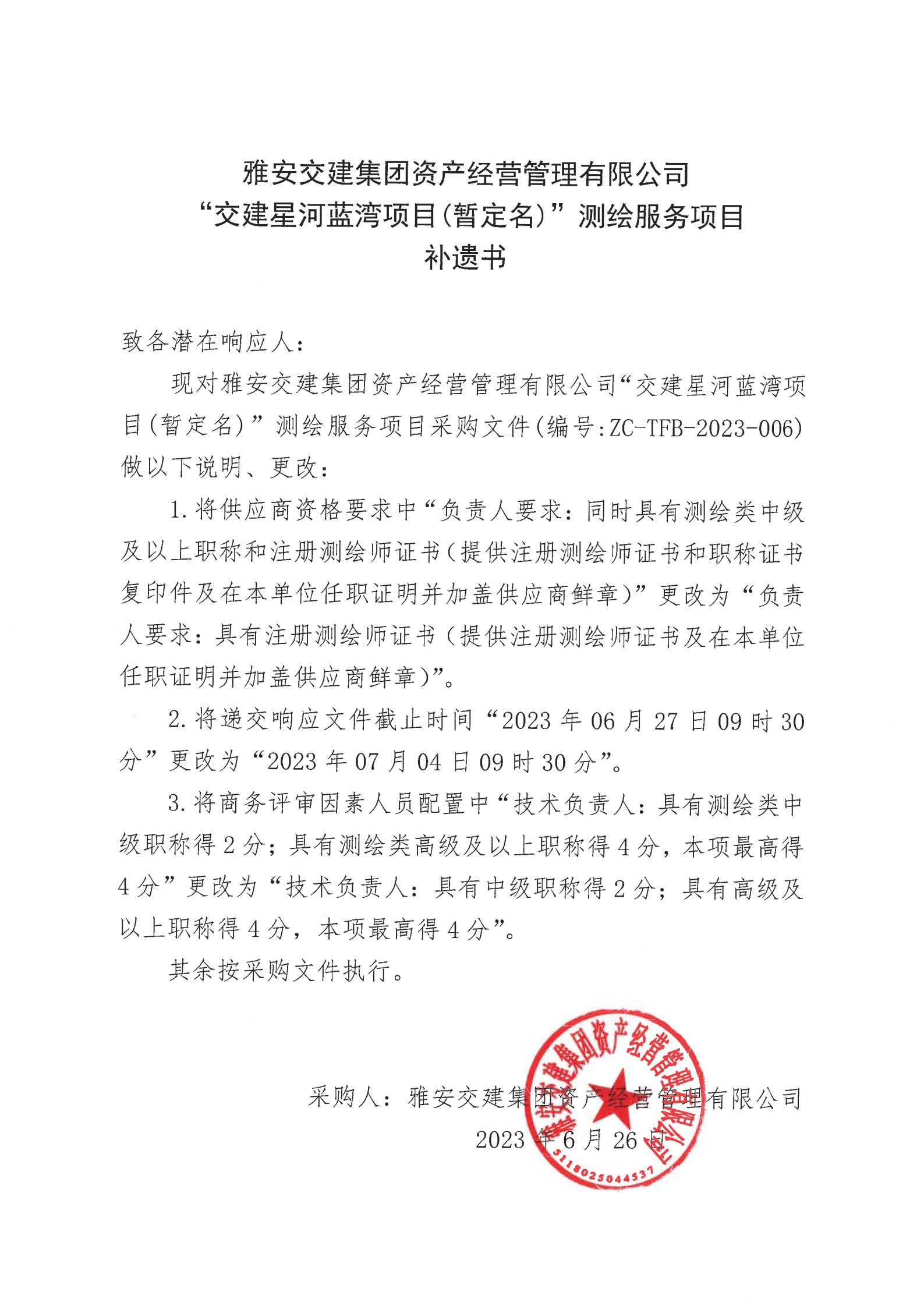 雅安交建集團資產(chǎn)經(jīng)營管理有限公司“交建星河藍灣項目(暫定名)”測繪服務項目補遺書