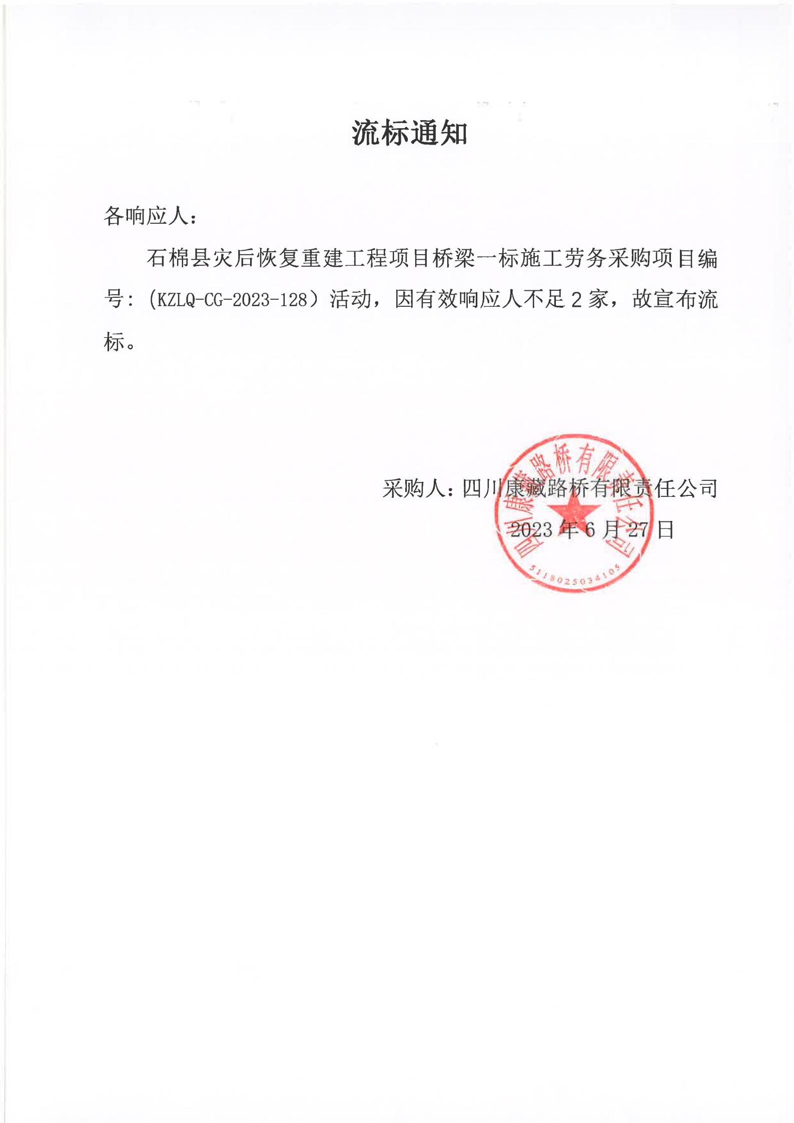 四川康藏路橋有限責任公司石棉縣災后恢復重建工程項目橋梁一標施工勞務采購流標通知