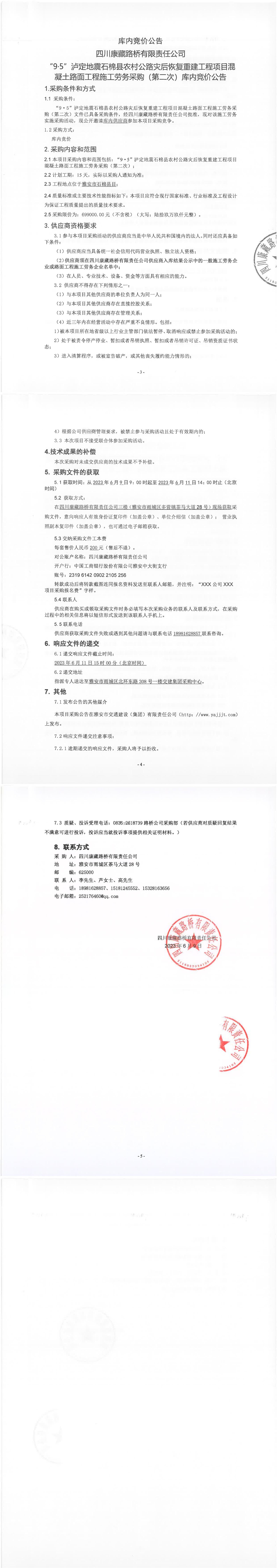 四川康藏路橋有限責任公司“9·5”瀘定地震石棉縣農村公路災后恢復重建工程項目混凝土路面工程施工勞務采購(第二次)庫內競價公告