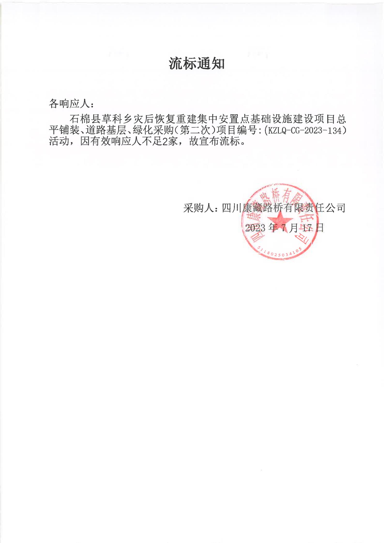 四川康藏路橋有限責(zé)任公司石棉縣草科鄉(xiāng)災(zāi)后恢復(fù)重建集中安置點(diǎn)基礎(chǔ)設(shè)施建設(shè)項(xiàng)目總平鋪裝、道路基層、綠化采購(第二次)流標(biāo)通知