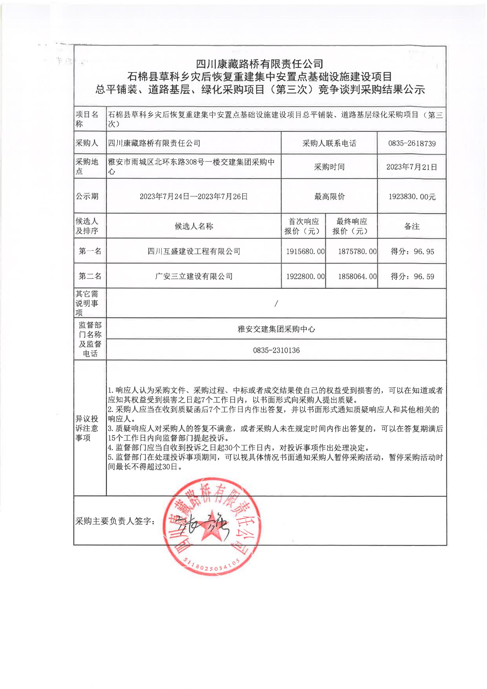 四川康藏路橋有限責(zé)任公司石棉縣草科鄉(xiāng)災(zāi)后恢復(fù)重建集中安置點基礎(chǔ)設(shè)施建設(shè)項目總平鋪裝、道路基層、綠化采購項目(第三次)競爭談判采購結(jié)果公示