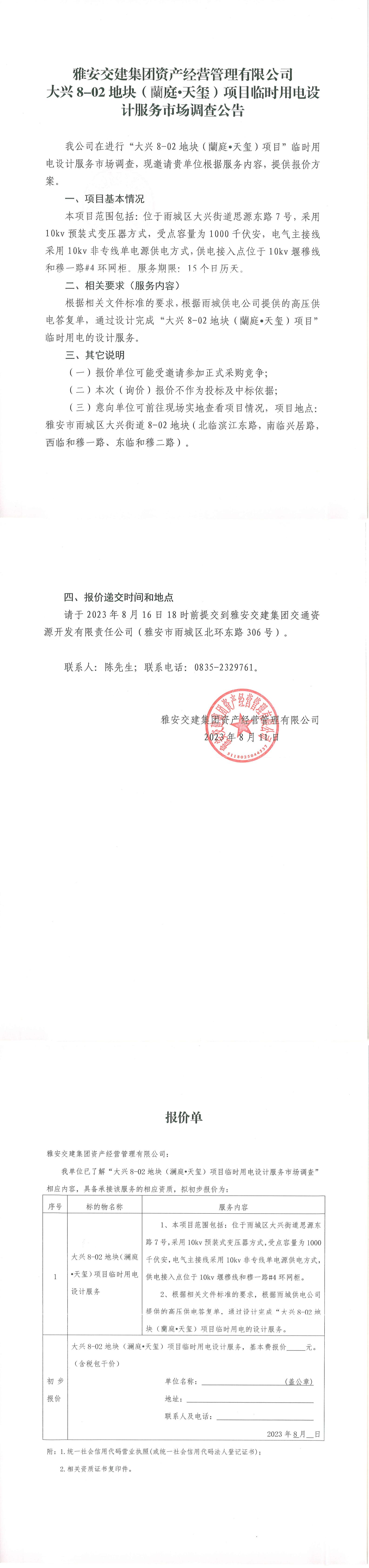 雅安交建集團資產(chǎn)經(jīng)營管理有限公司大興8-02地塊(蘭庭·天璽)項目臨時用電設計服務市場調(diào)查公告