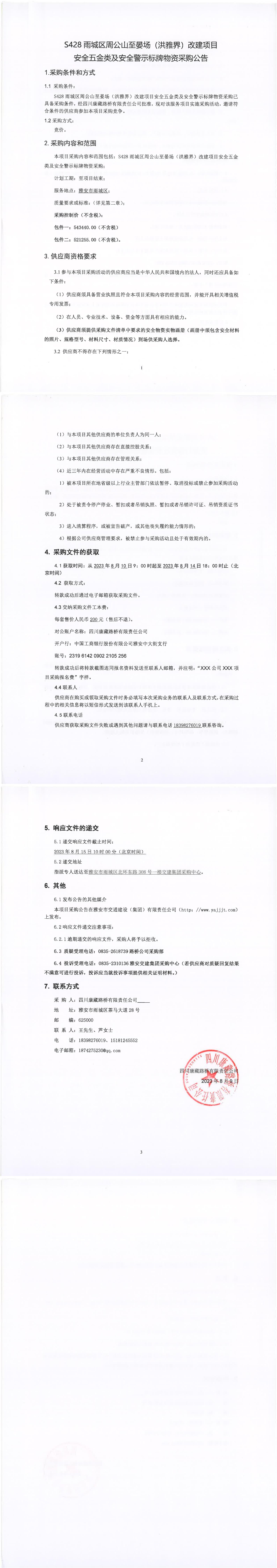 四川康藏路橋有限責(zé)任公司S428雨城區(qū)周公山至宴場(洪雅界)改建項(xiàng)目安全五金類及安全警示標(biāo)牌物資采購公告
