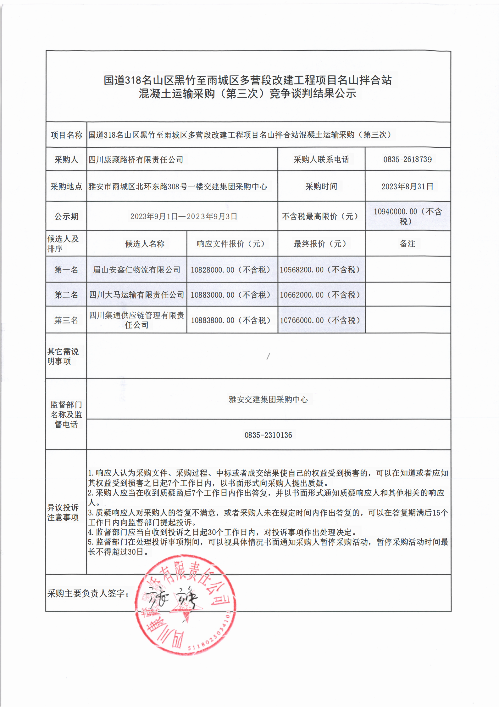 四川康藏路橋有限責(zé)任公司國道318名山區(qū)黑竹至至雨城區(qū)多營段改建工程項目名山拌合站混凝土運(yùn)輸采購(第三次)競爭談判結(jié)果公示