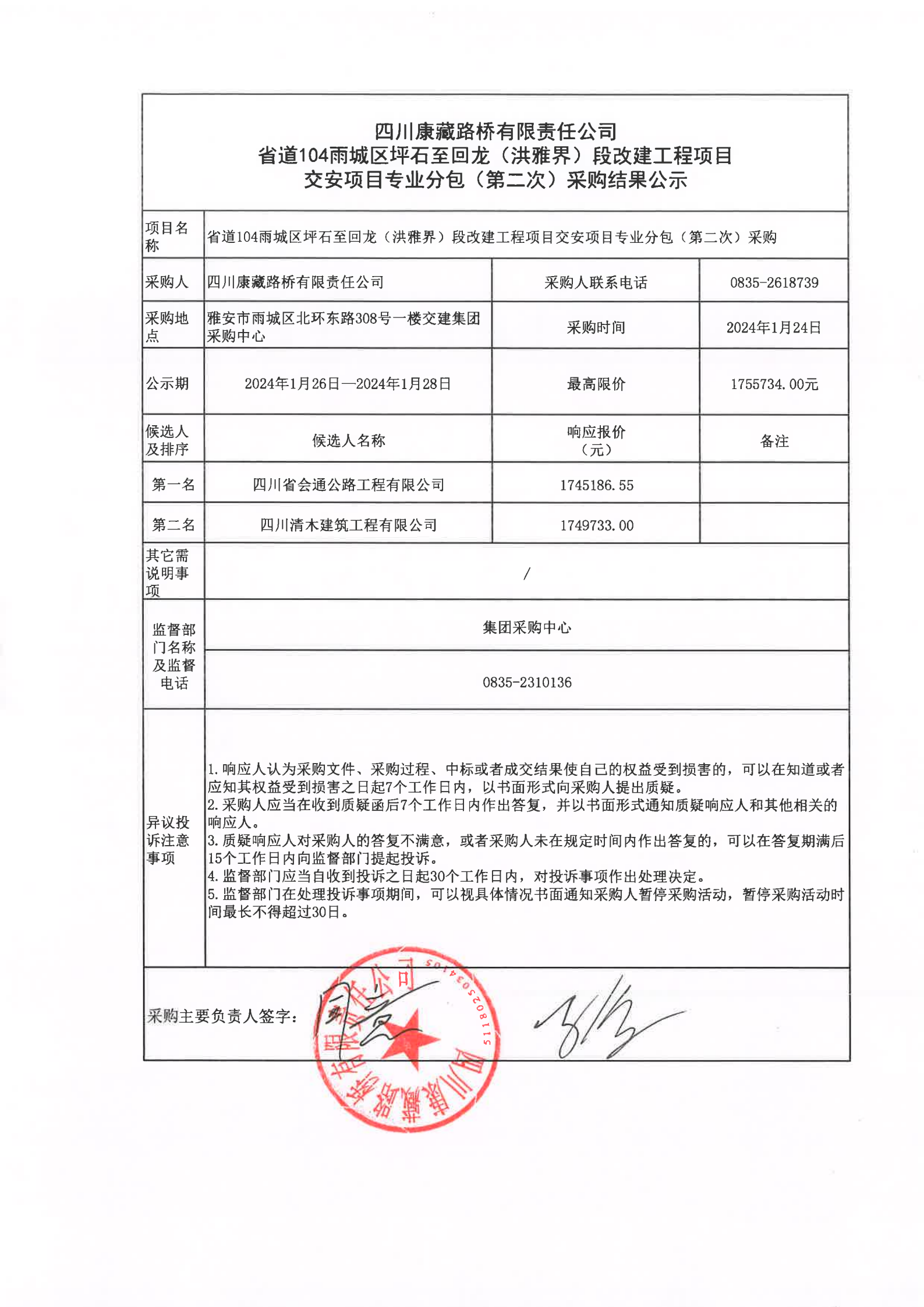 四川康藏路橋有限責(zé)任公司省道104雨城區(qū)坪石至回龍(洪雅界)段改建工程項(xiàng)目交安項(xiàng)目專業(yè)分包(第二次)采購(gòu)結(jié)果公示