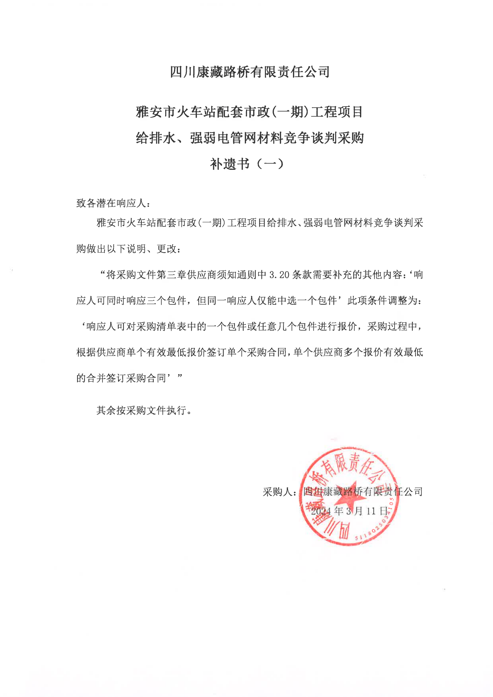 四川康藏路橋有限責(zé)任公司雅安市火車站配套市政(一期)工程項目給排水、強(qiáng)弱電管網(wǎng)材料競爭談判采購補(bǔ)遺書