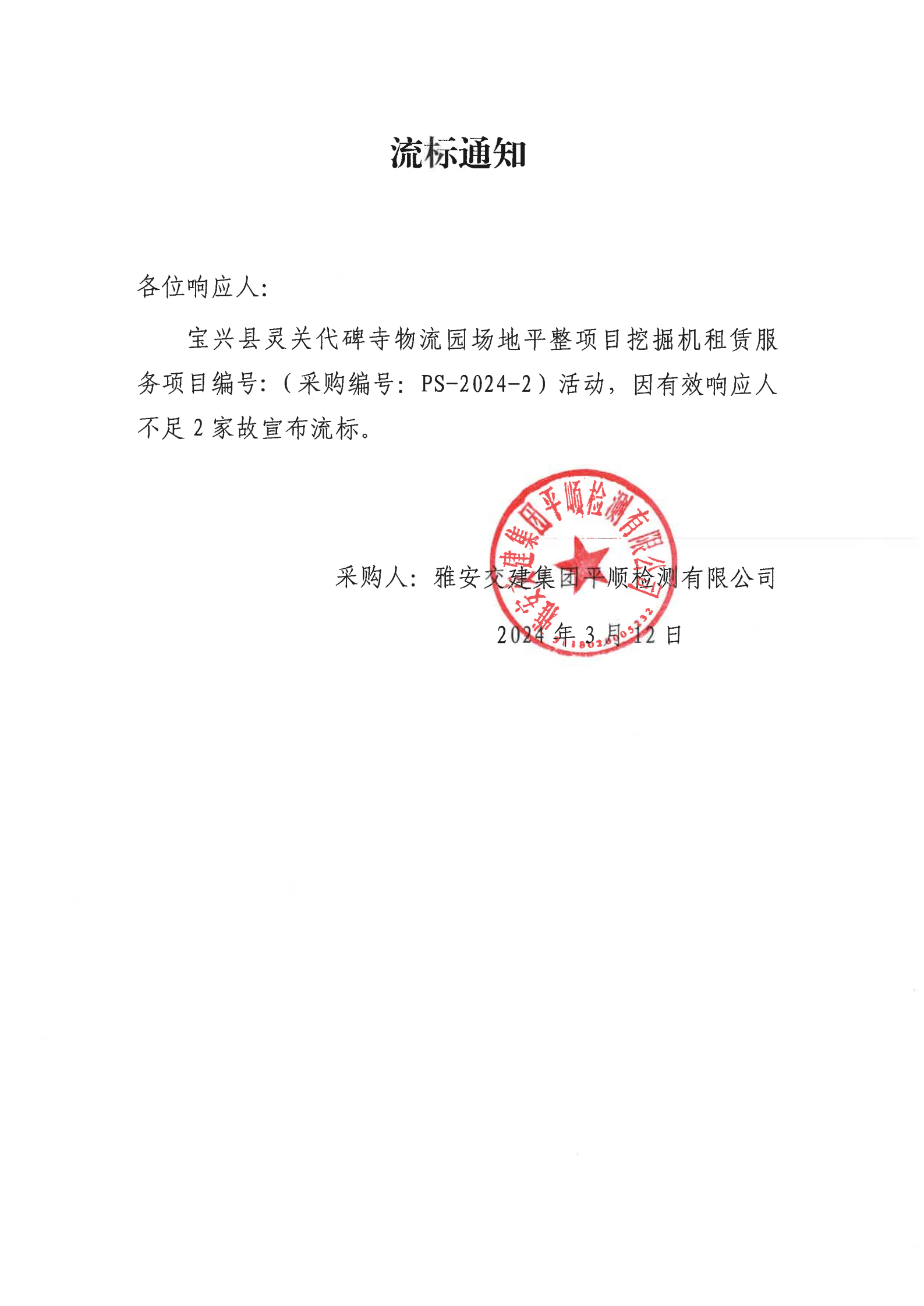 雅安交建集團平順檢測有限公司寶興縣靈關(guān)代碑寺物流園場地平整項目挖掘機租賃服務(wù)流標通知