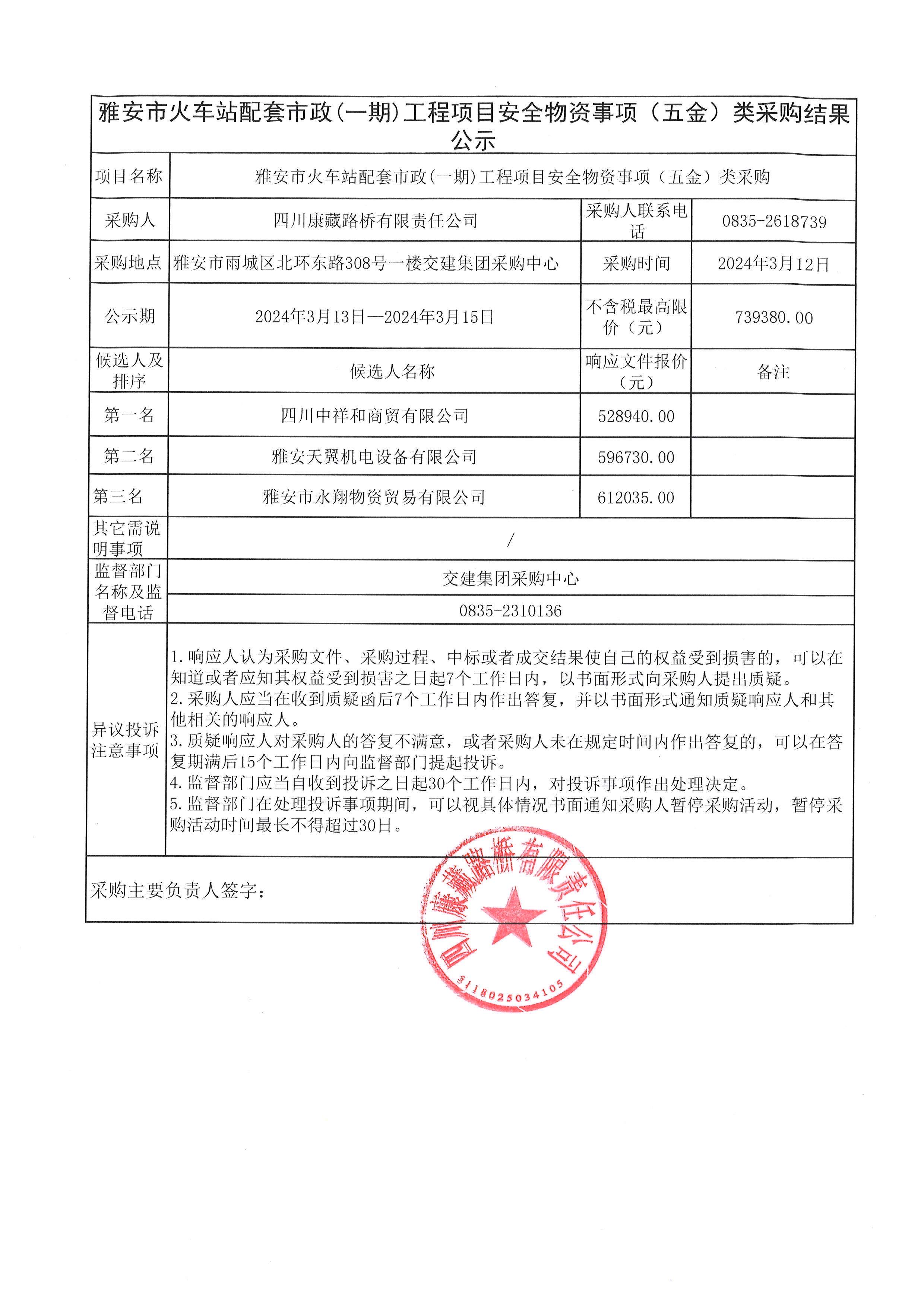 四川康藏路橋有限責(zé)任公司雅安市火車站配套市政(一期)工程項(xiàng)目安全物資(廣告)采購(gòu)結(jié)果公示