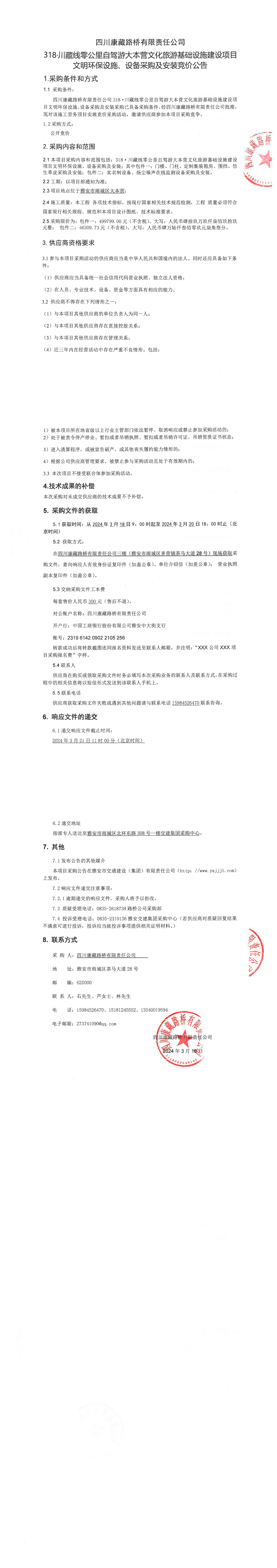 四川康藏路橋有限責任公司318·川藏公路零公里自駕游大本營文化旅游基礎(chǔ)設(shè)施建設(shè)項目文明環(huán)保設(shè)施、設(shè)備采購及安裝競價公告