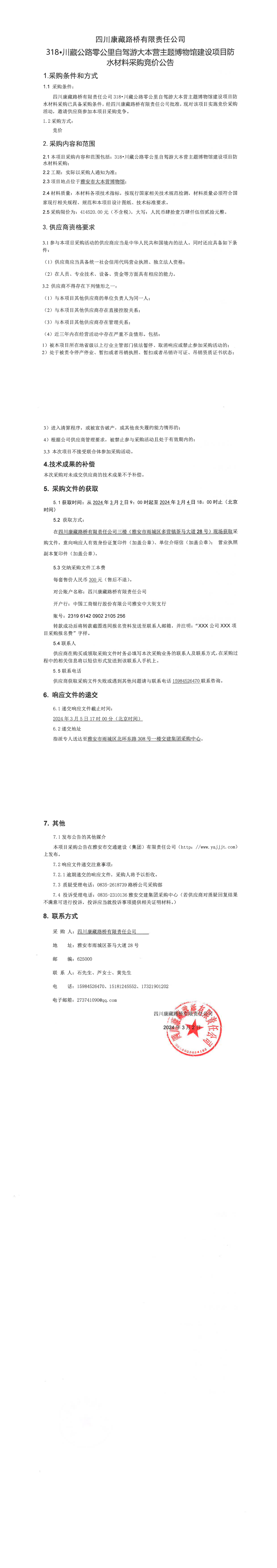 四川康藏路橋有限責任公司318·川藏公路零公里自駕游大本營主題博物館建設項目防水材料采購競價公告