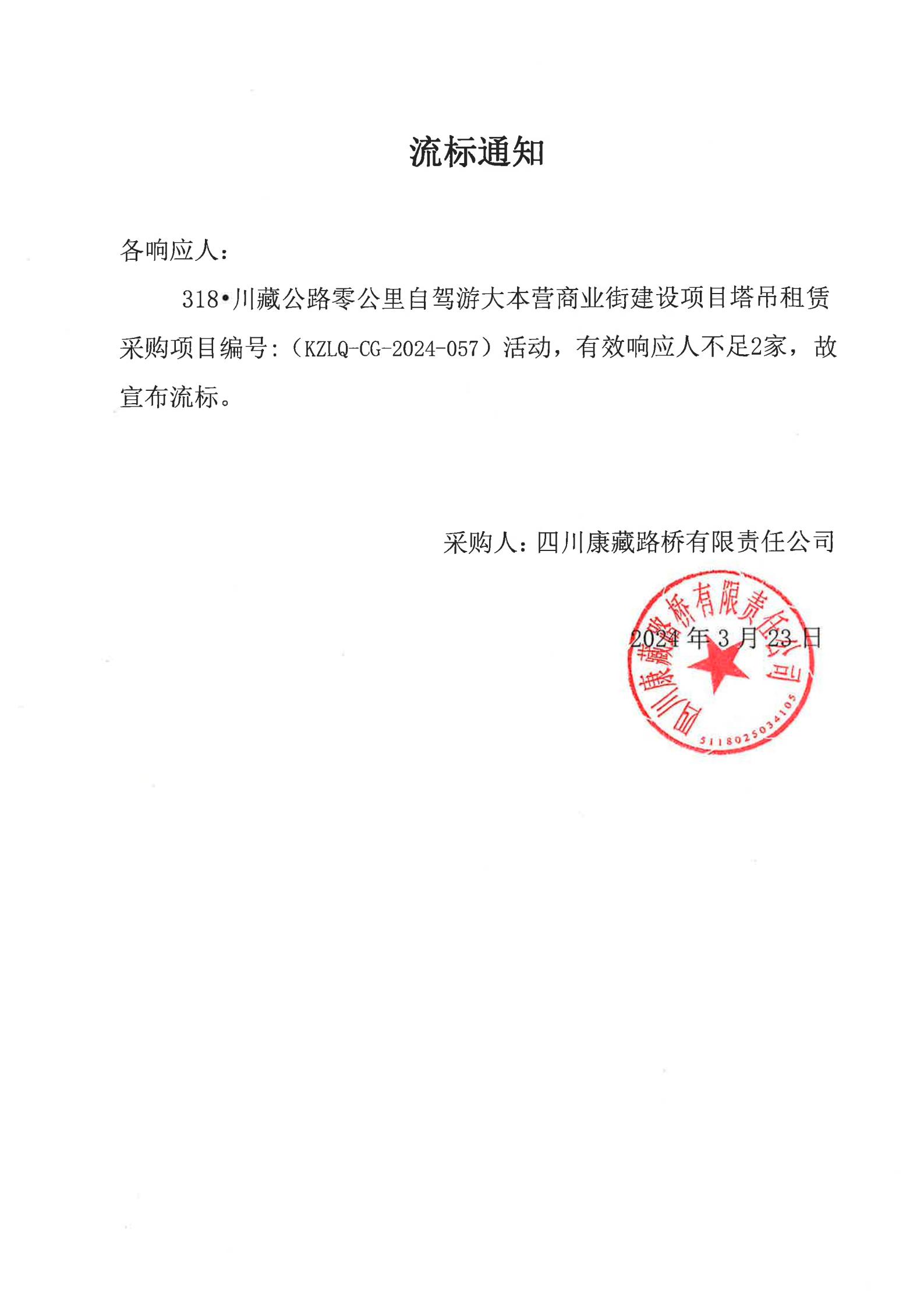 四川康藏路橋有限責(zé)任公司318•川藏公路零公里自駕游大本營商業(yè)街建設(shè)項(xiàng)目塔吊租賃采購流標(biāo)通知