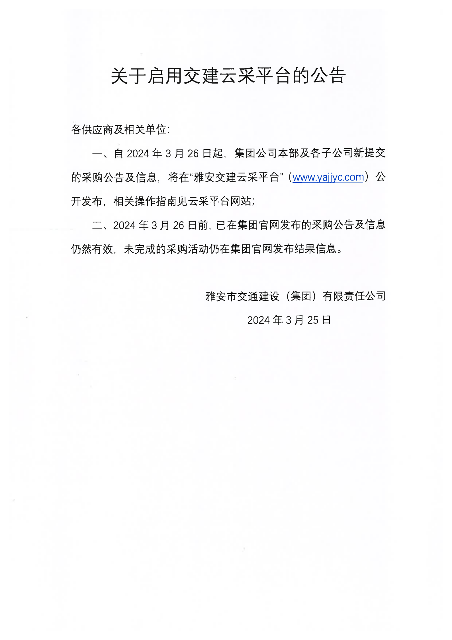 雅安市交通建設(集團)有限責任公司關于啟用交建云采平臺的公告