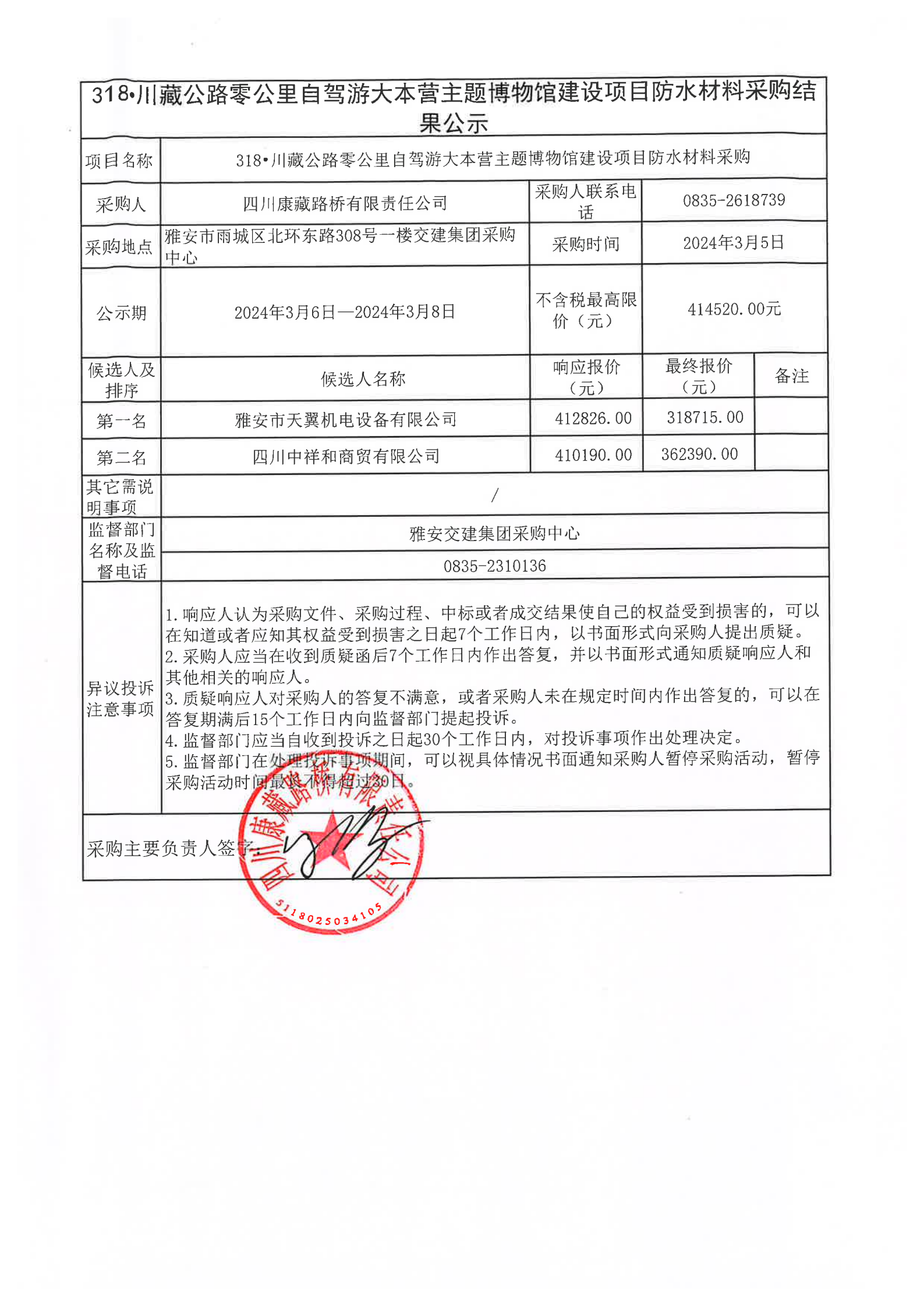 四川康藏路橋有限責(zé)任公司318·川藏公路零公里自駕游大本營(yíng)主題博物館建設(shè)項(xiàng)目防水材料采購(gòu)結(jié)果公示