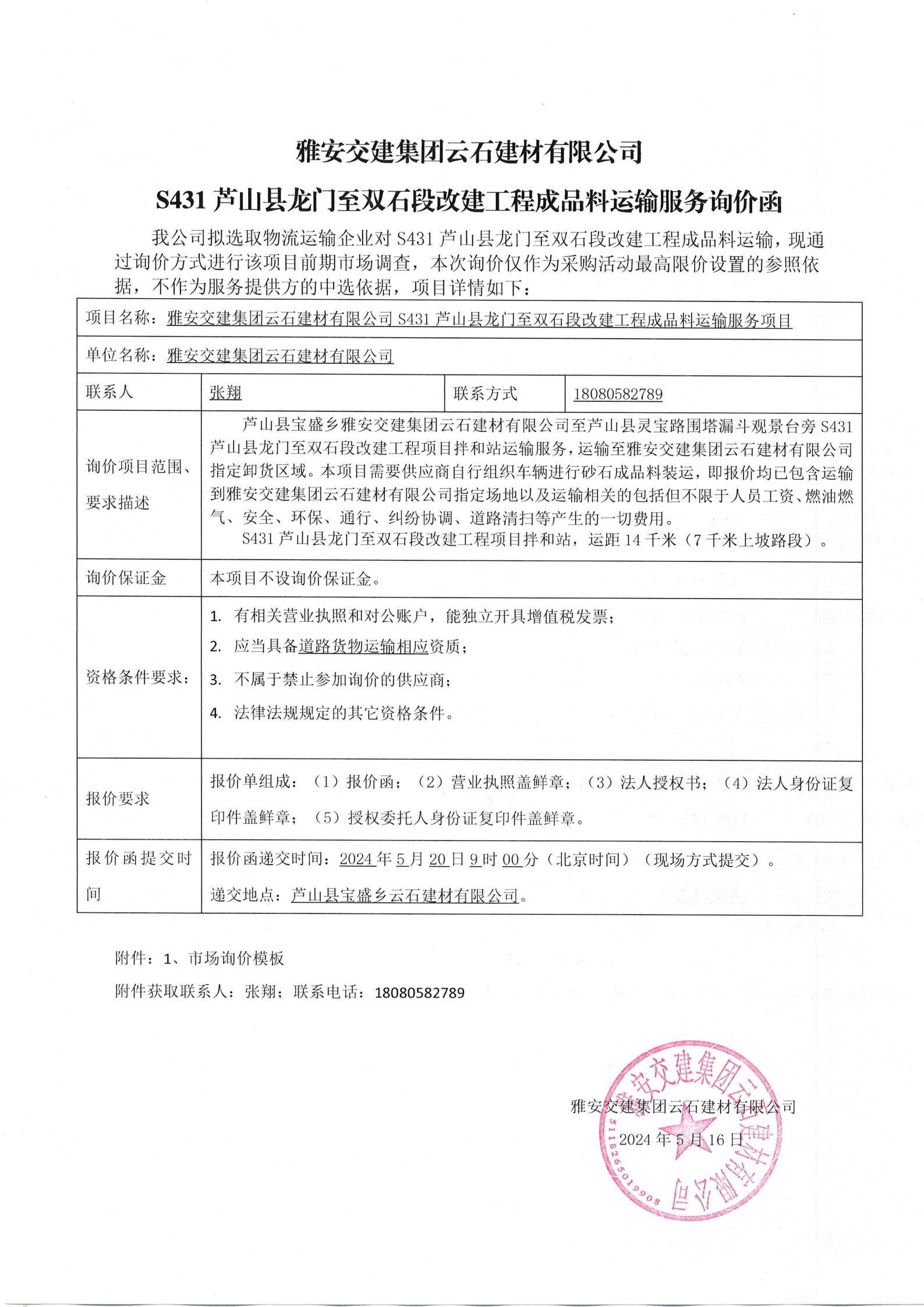 雅安交建集團(tuán)云石建材有限公司S431蘆山縣龍門至雙石段改建工程成品料運(yùn)輸服務(wù)項目詢價函