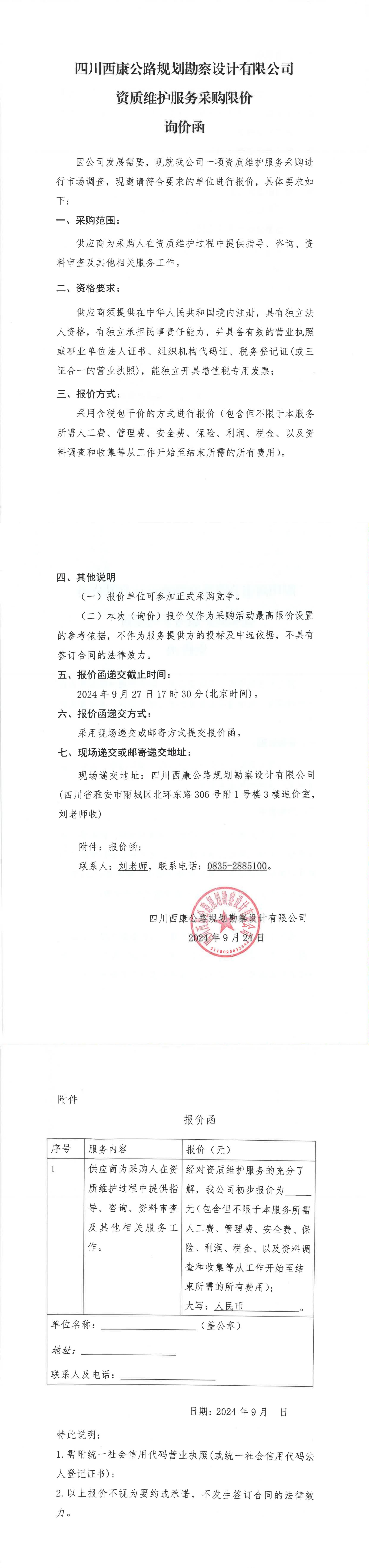 四川西康公路規(guī)劃勘察設(shè)計(jì)有限公司資質(zhì)維護(hù)服務(wù)采購限價(jià)詢價(jià)函