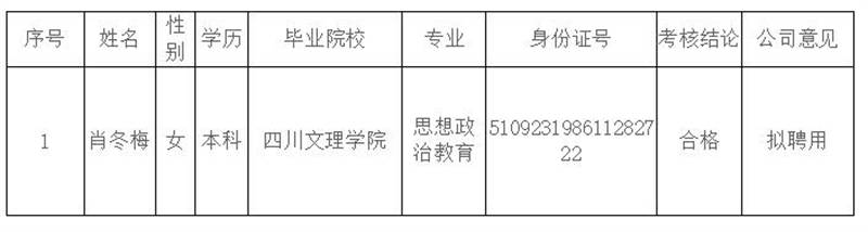 根據(jù)《雅安交建集團(tuán)康居建設(shè)工程質(zhì)量與室內(nèi)環(huán)境污染檢測有限公司綜合考核聘用工作方案》,按照“公開、平等、競爭、擇優(yōu)”的原則,經(jīng)考核合格,現(xiàn)將我公司擬聘用人員名單予以公示。