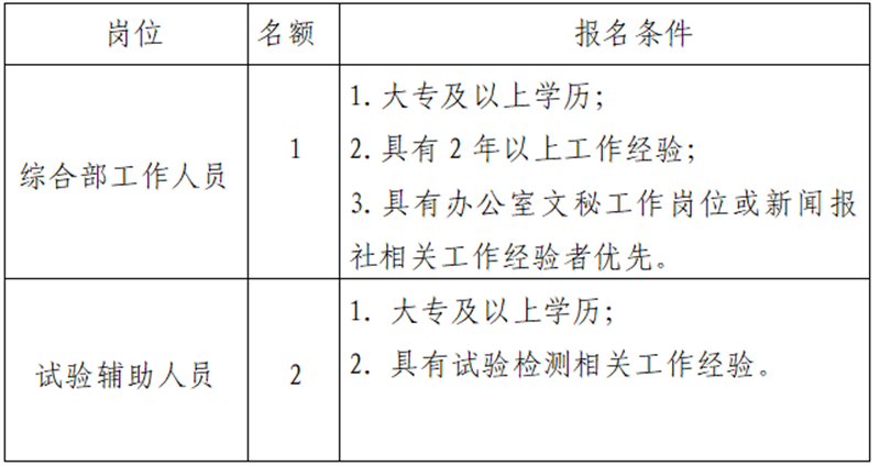 雅安交建集團工程檢測有限公司是雅安市交通建設(shè)(集團)有限責任公司下屬子公司。主要從事主要從事公路、橋梁及隧道等的檢測等業(yè)務(wù),F(xiàn)根據(jù)公司業(yè)務(wù)發(fā)展需要,擬招聘3名工作人員,現(xiàn)將有關(guān)事項公告如下: