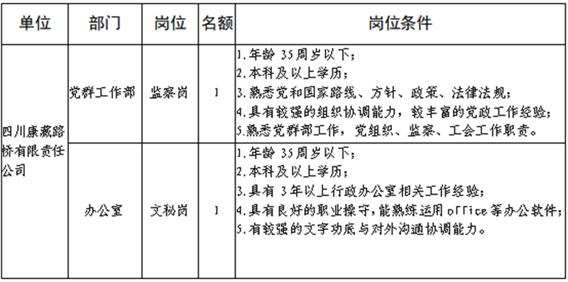 根據(jù)發(fā)展需要,決定面向社會(huì)公開招聘雅安市交通建設(shè)(集團(tuán))有限責(zé)任公司(以下簡(jiǎn)稱“雅安交建集團(tuán)”)所屬子公司工作人員16名,現(xiàn)將有關(guān)事項(xiàng)公告如下: