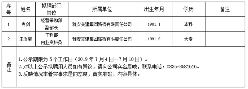 根據(jù)集團(tuán)公司《人才選聘實(shí)施辦法》,通過智聯(lián)招聘報(bào)名、資格審查、面試、體檢、考察等程序,經(jīng)集團(tuán)公司研究,對以下擬聘用人員予以公示: