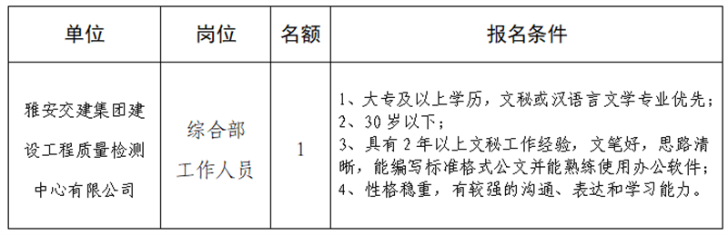 根據(jù)發(fā)展需要,決定面向社會(huì)公開(kāi)招聘雅安市交通建設(shè)(集團(tuán))有限責(zé)任公司(以下簡(jiǎn)稱(chēng)“雅安交建集團(tuán)”)所屬子公司工作人員1名,現(xiàn)將有關(guān)事項(xiàng)公告如下: