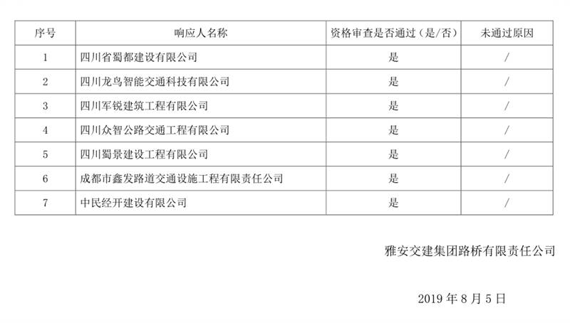 雅安交建集團(tuán)路橋有限責(zé)任公司公路安全設(shè)施施工企業(yè)入庫(kù)比選結(jié)果