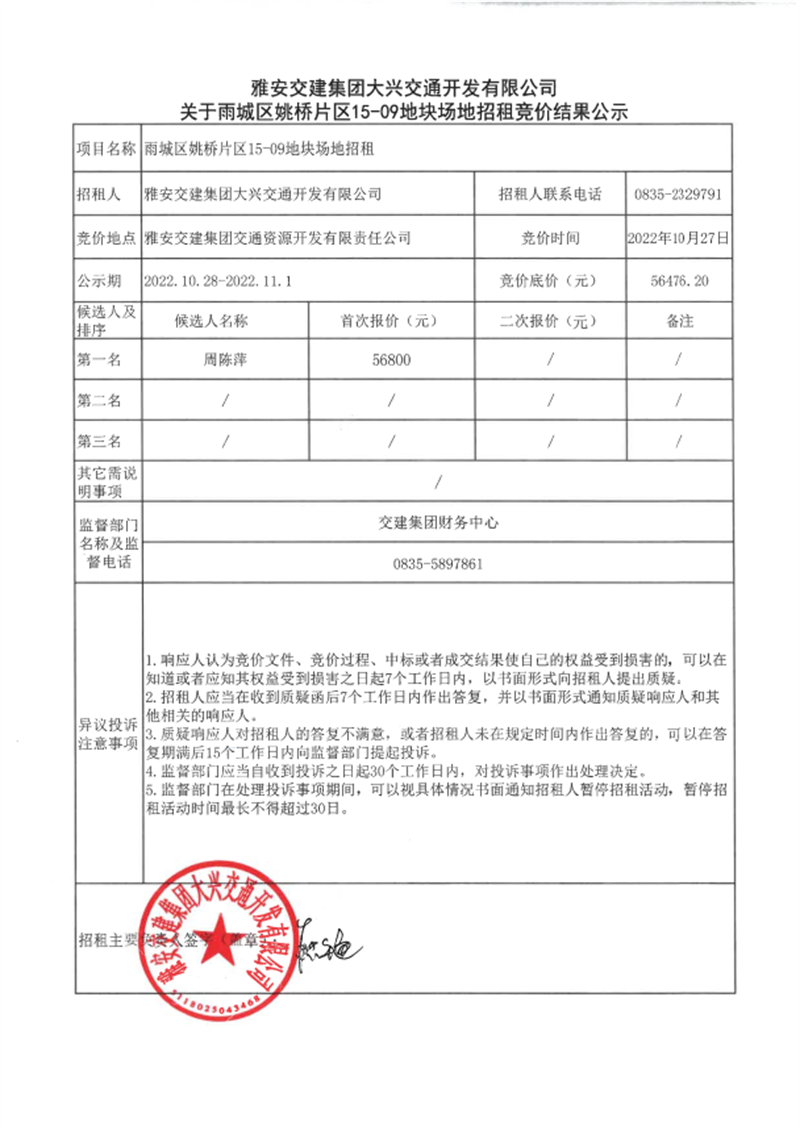 雅安交建集團(tuán)大興交通開(kāi)發(fā)有限責(zé)任公司關(guān)于雨城區(qū)姚橋片區(qū)15-09地塊場(chǎng)地招租競(jìng)價(jià)結(jié)果公示