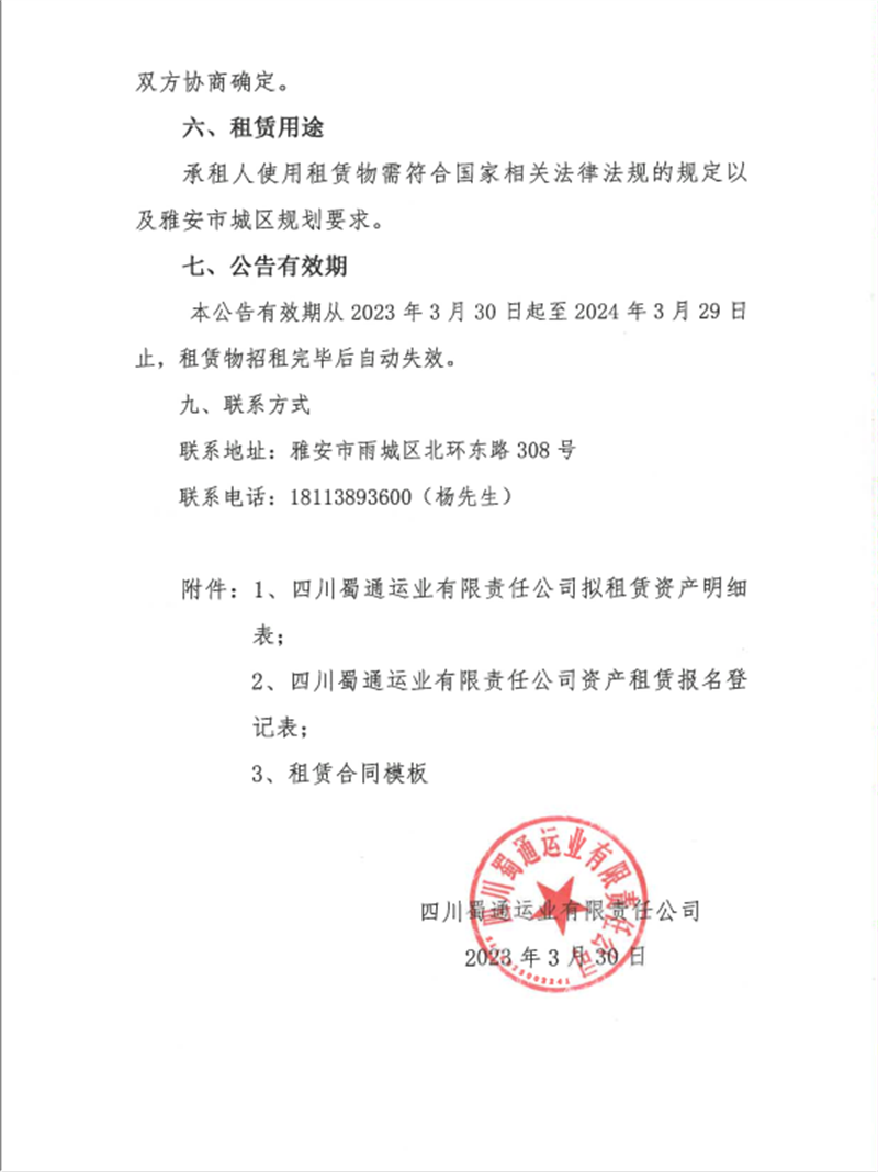蜀通運業(yè)有限責任公司關于閑置資產公開招租的公告附件