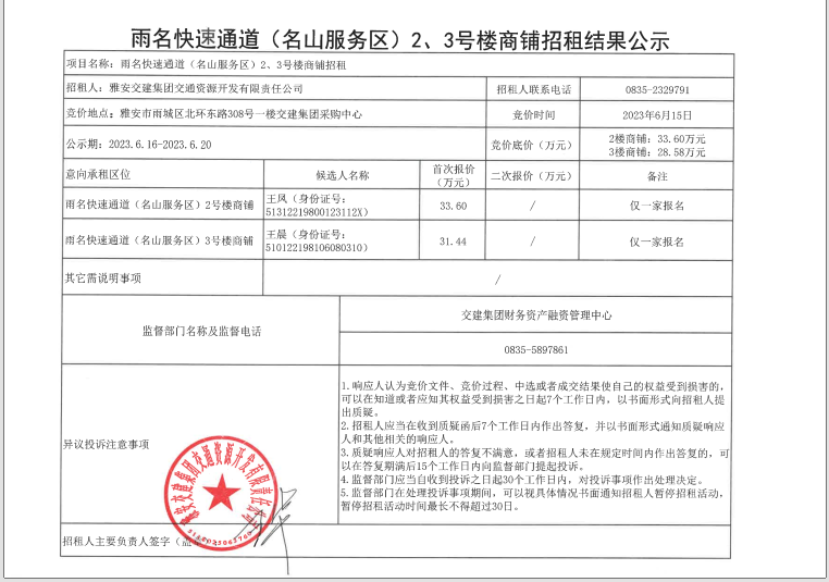 交通資源開發(fā)公司雨名快速通道(名山服務區(qū))2、3號樓商鋪招租結果公示