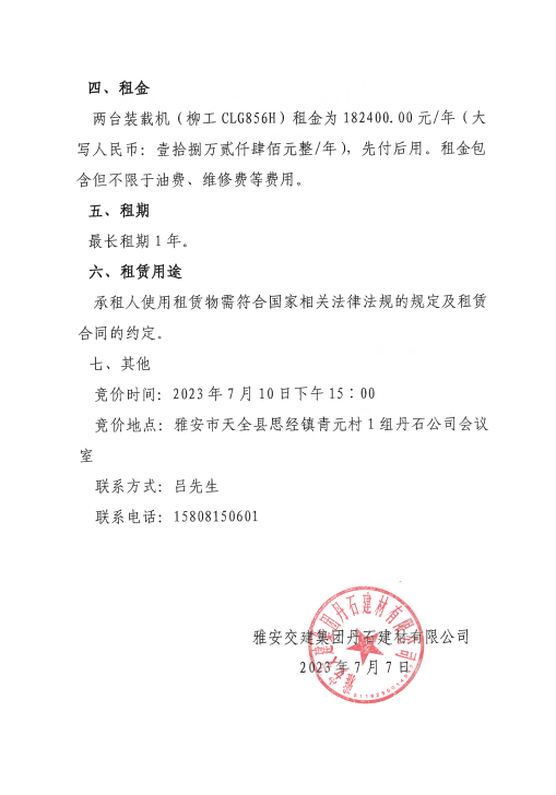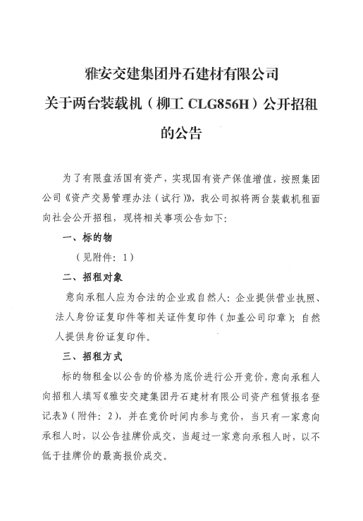雅安交建集團(tuán)丹石建材有限公司關(guān)于2臺(tái)裝載機(jī)公開招租的公告附件