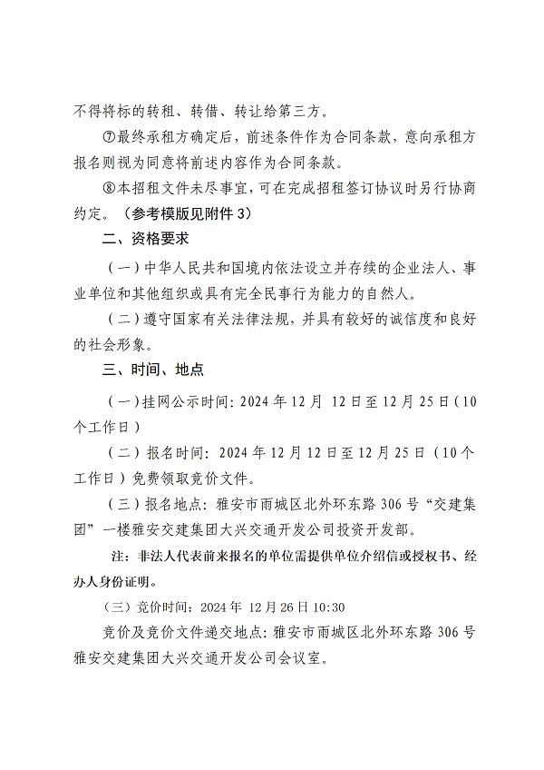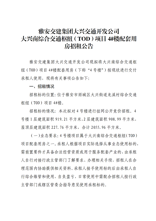 雅安交建集團(tuán)大興交通開發(fā)公司大興南綜合交通樞紐(TOD)項(xiàng)目4#樓配套用房招租公告