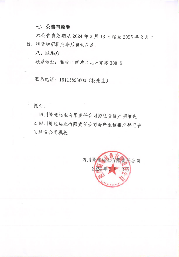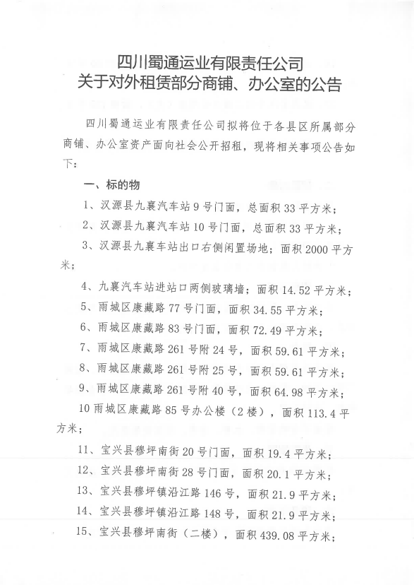 四川蜀通運業(yè)有限責(zé)任公司關(guān)于對外租賃部分門面、辦公室資產(chǎn)的公告附件