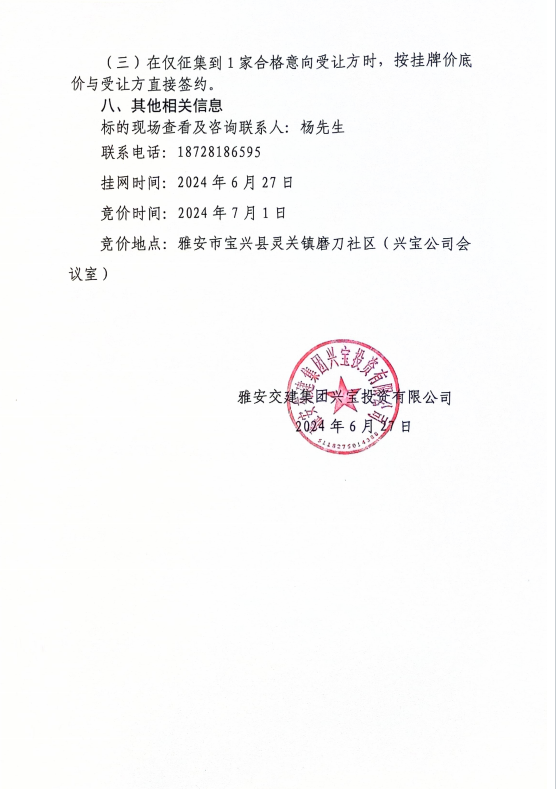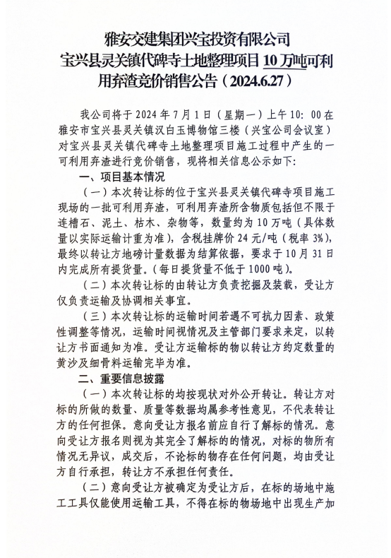 雅安交建集團興寶投資有限公司寶興縣靈關(guān)鎮(zhèn)代碑寺土地整理項目10萬噸可利用棄渣競價銷售公告(2024.6.27)