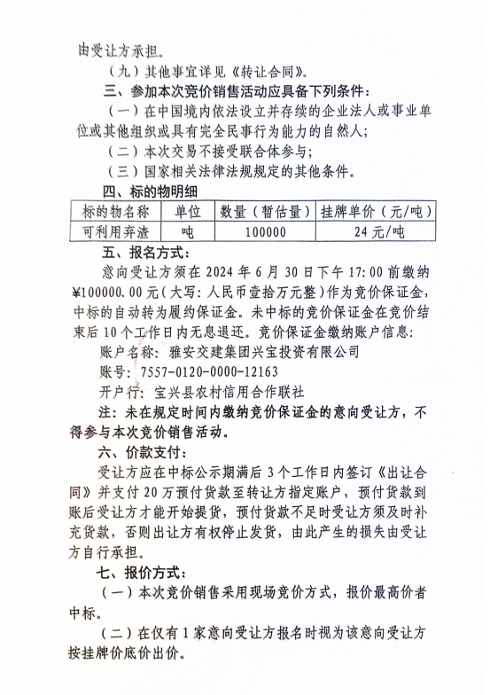 雅安交建集團興寶投資有限公司寶興縣靈關(guān)鎮(zhèn)代碑寺土地整理項目10萬噸可利用棄渣競價銷售公告(2024.6.21)