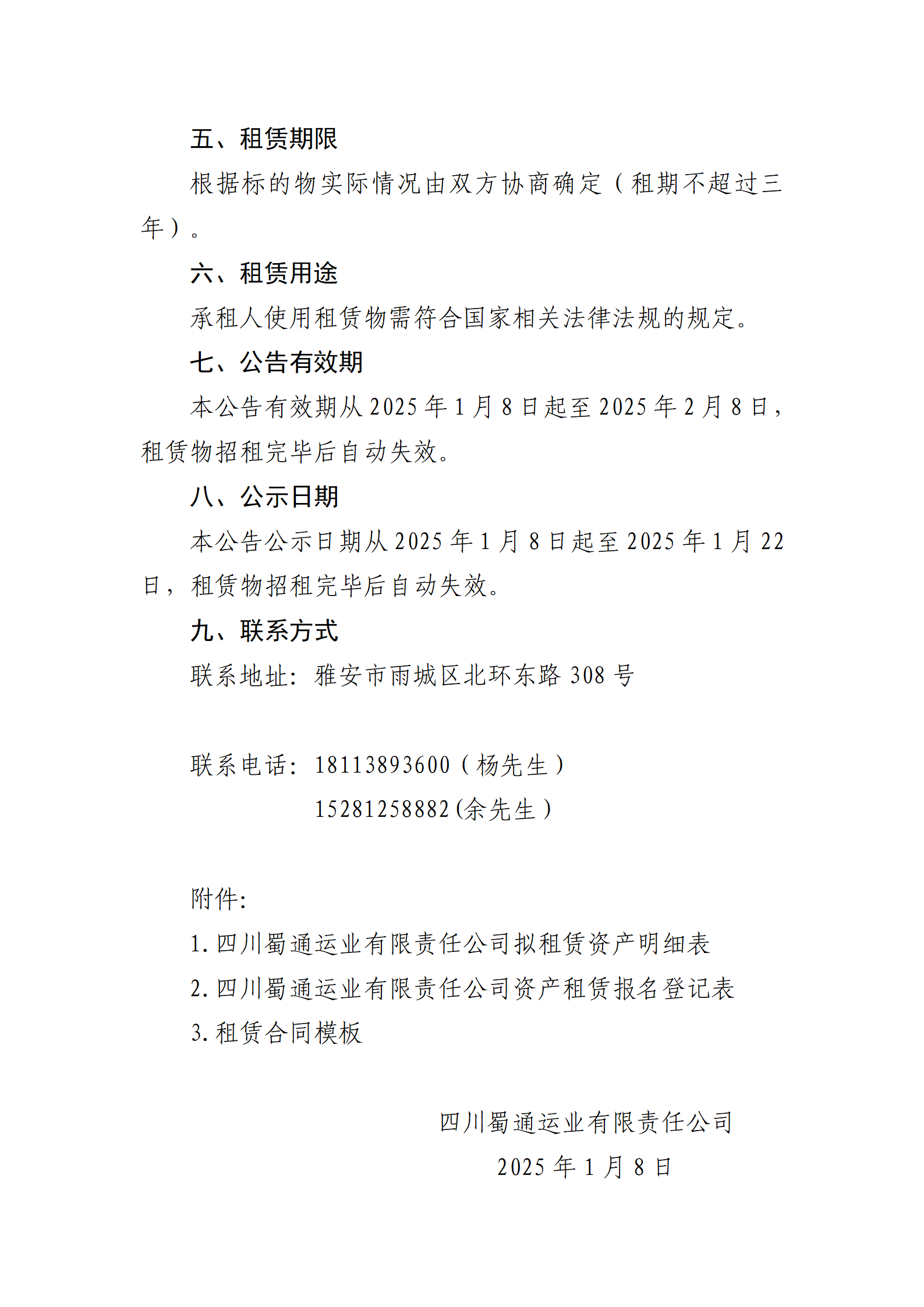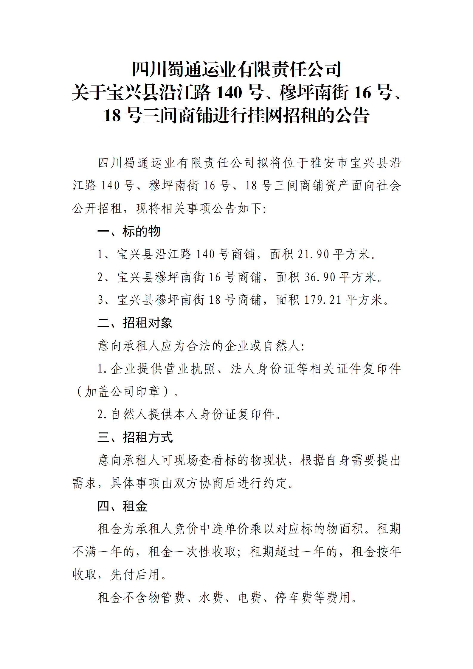 四川蜀通運(yùn)業(yè)有限責(zé)任公司 關(guān)于寶興縣沿江路140號、穆坪南街16號、18號三間商鋪進(jìn)行掛網(wǎng)招租的公告
