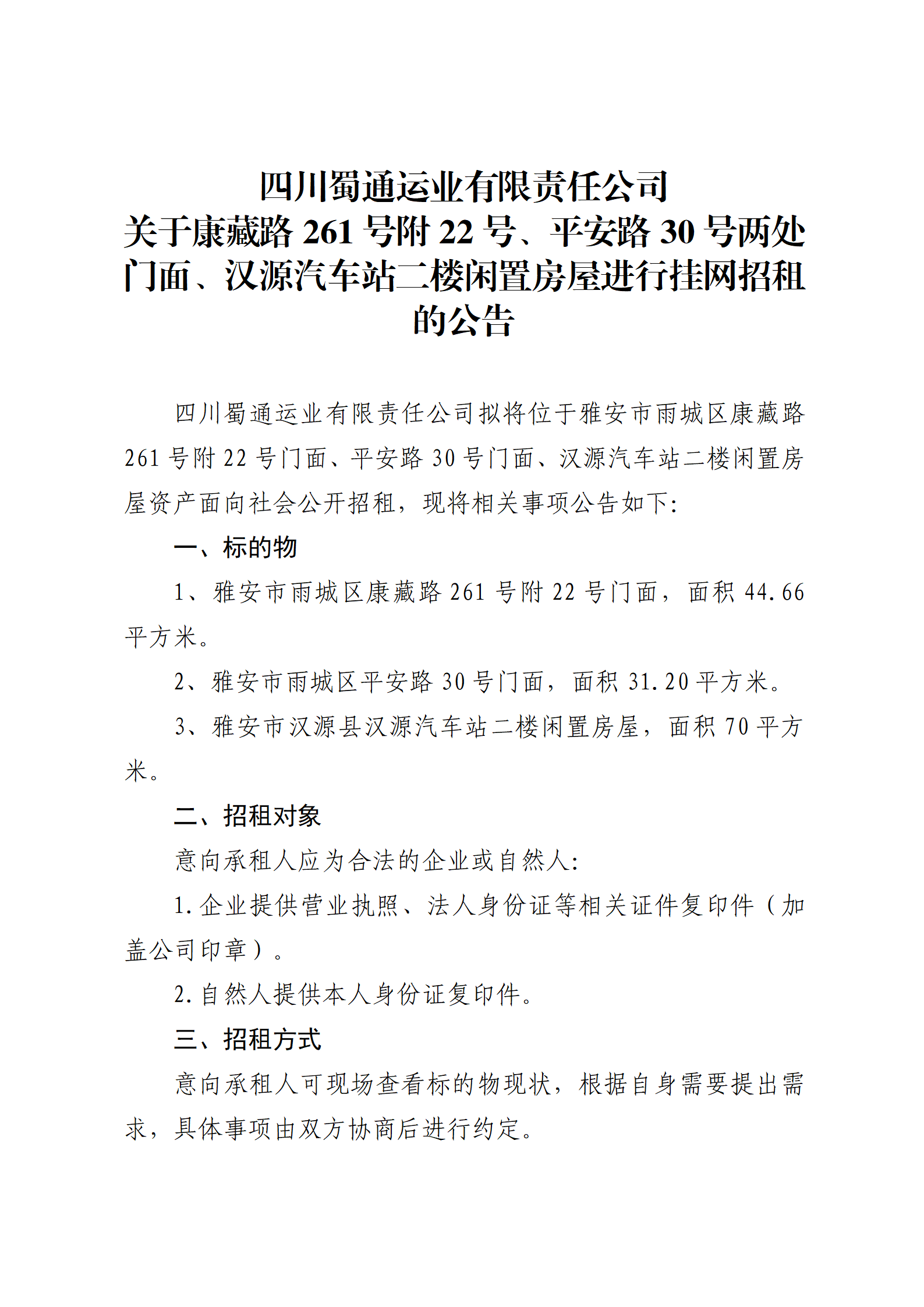 四川蜀通運業(yè)有限責(zé)任公司 關(guān)于康藏路261號附22號、平安路30號兩處門面、漢源汽車站二樓閑置房屋進行掛網(wǎng)招租的公告