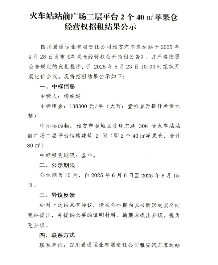 火車站站前廣場二層平臺2個40㎡蘋果倉經(jīng)營權招租結果公示